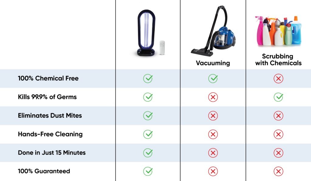 - Medical grade UV light that cleans better than you could ever scrub, all without the chemicals, toxins, and pollutants found in most household cleaners.