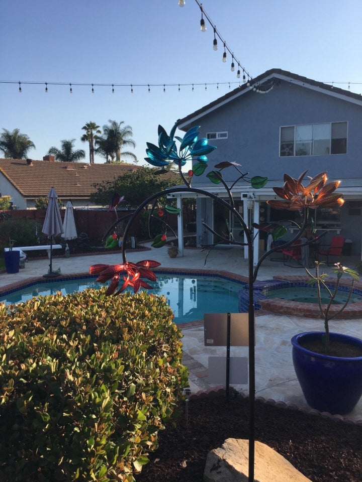 You'll enjoy a beautiful outdoor kinetic wind spinner with a three tier flower cascade of yellow, pink and blue blooms and butterfly accents. The eye-catching, colorful floral design is brought into motion whenever the wind blows.
