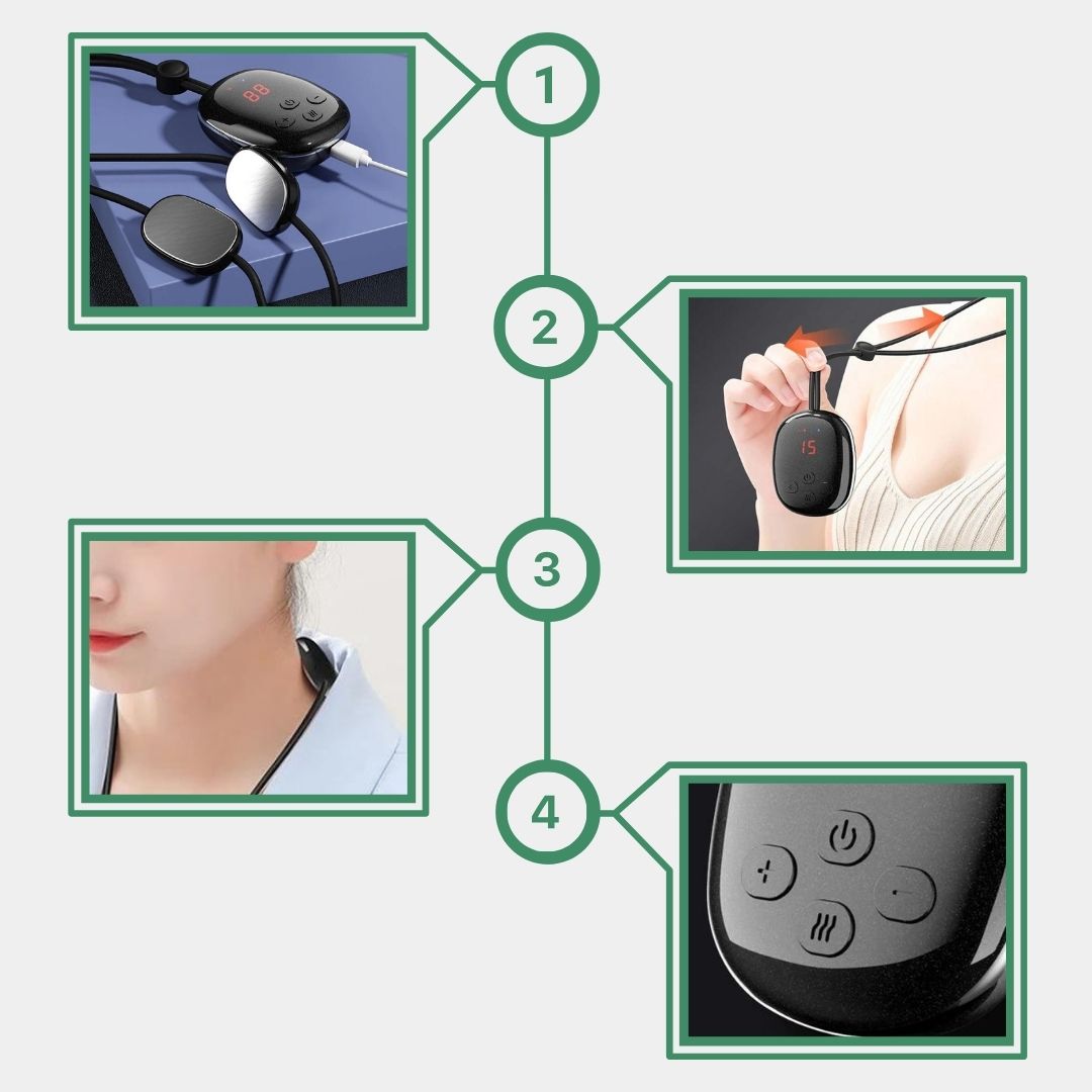- Keep the device on your neck for 5 minutes to start feeling the heat and vibration.