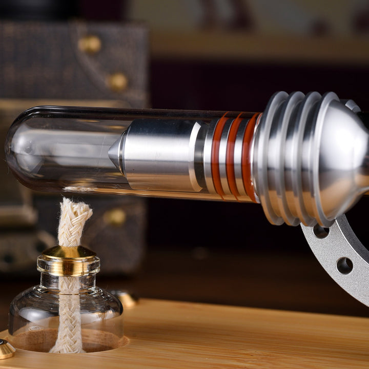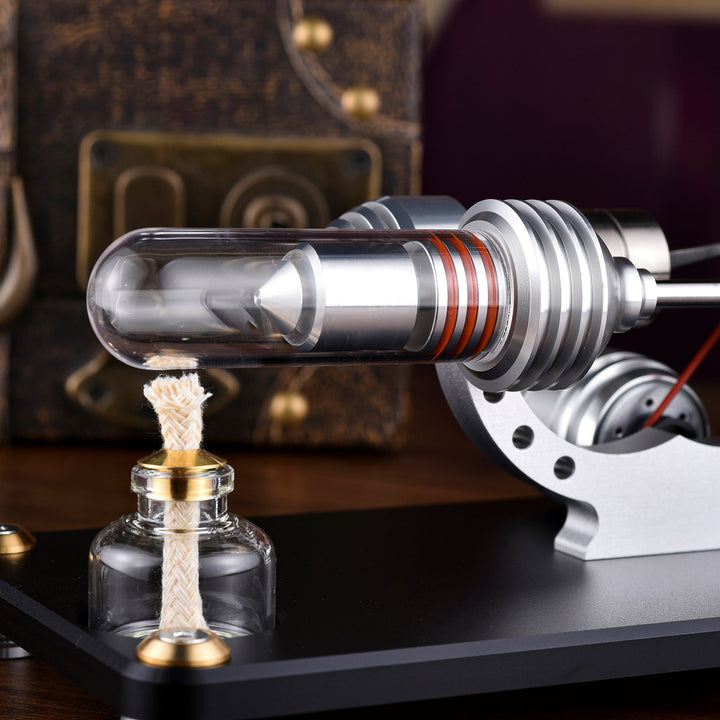 The whole series adopts brass piston, stainless steel connecting rod, aluminum alloy flywheel and aluminum alloy bracket. Except for the M14-06-S model, all others are equipped with a brushed generator as standard. We have connected an LED lamp bead to the output line of the generator, and made an aluminum alloy motor outside to fix it inside. When the machine is running, the power is output to the motor to light up the lamp bead, which can more intuitively understand the whole process of heat energy conversion to kinetic energy and then to electrical energy.
