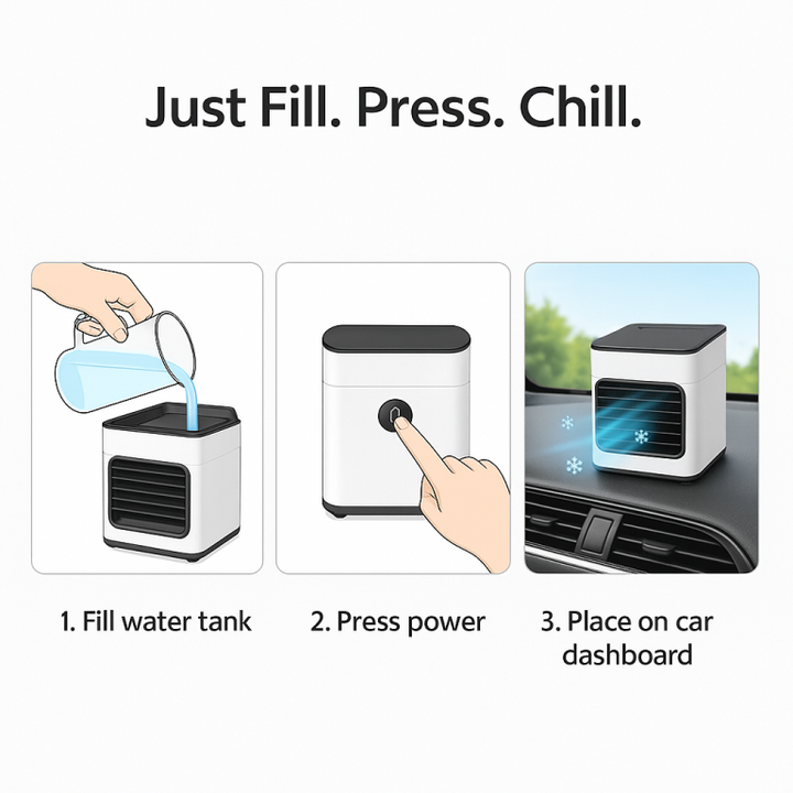 Feel the refreshing breeze wherever you are! The Portable Car AC instantly cools and humidifies the air around you, providing a light, pleasant atmosphere within minutes.
