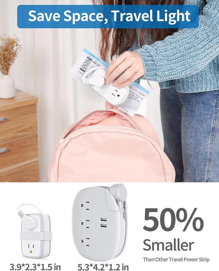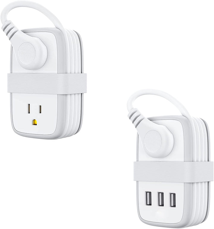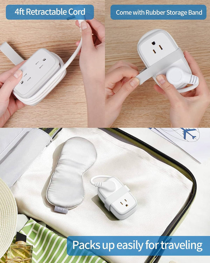 【4FT Retractable Extension Cord】: 4ft travel extension cord with rubber organize band wraps around itself to makes it easy to pack and storage. Save more precious travel luggage space. 4 foot extension cord is long enough to reach further outlet and still be able to sit at desk or nightstand.