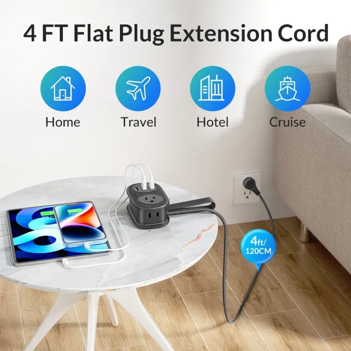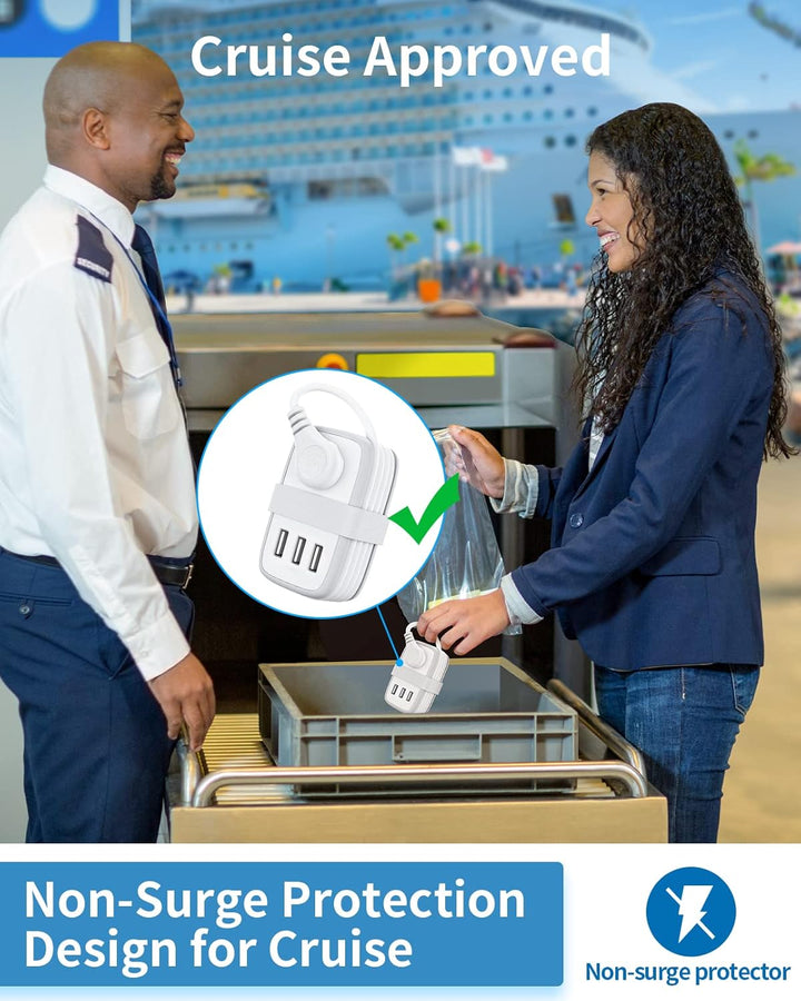 【Cruise Accessories Must Haves】: This cruise power strip comes with No surge protection, makes it absolutely a must have Home and cruise essential. small extension cord comes with 4 outlets 3 USB ports, small size and 4ft short extension cord which makes it easy to storage. Easy to carry and suitable for traveler cruise ships, hotels, airports.