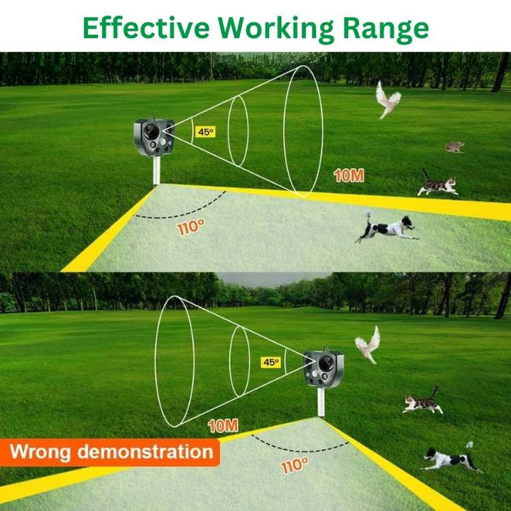 This device is equipped with a precision 110° PIR motion sensor. When movement is detected within a 9m range, it activates a powerful ultrasonic pulse and flashing LED lights scaring pests away instantly.